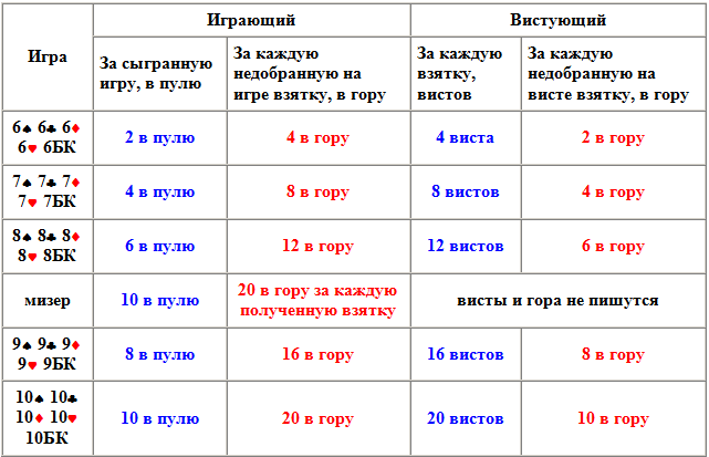 Играющий получает в гору двойную стоимость игры за каждую недобранную взятку.