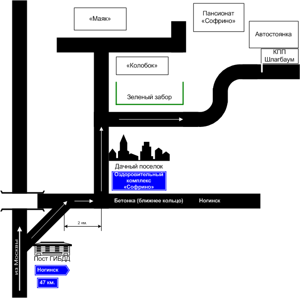 "Оздоровительный Комплекс Софрино" - он стоит у поворота налево.