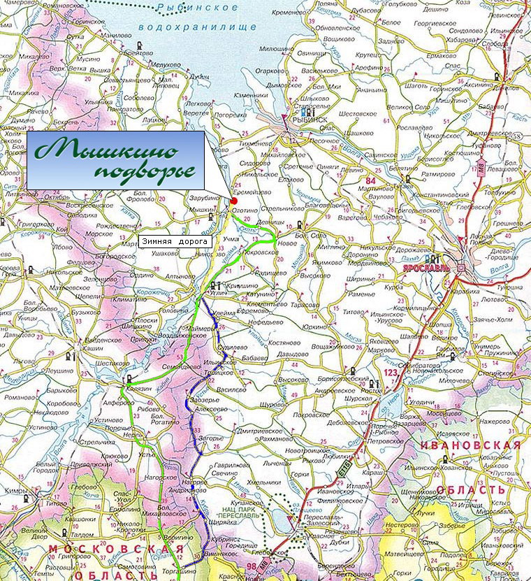 После выезда из Сергиевого Посада ехать примерно 104 км (никуда не сворачивая) в направлении г. Калязина. Не доезжая 2 км до Калязина, поворот направо на Углич. Указатель Углич - 60 км.